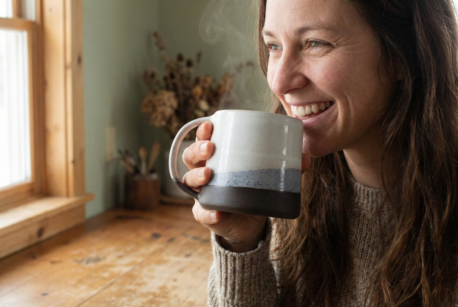 - Porcelain construction presented as the material of the piece for typical mug use and display.